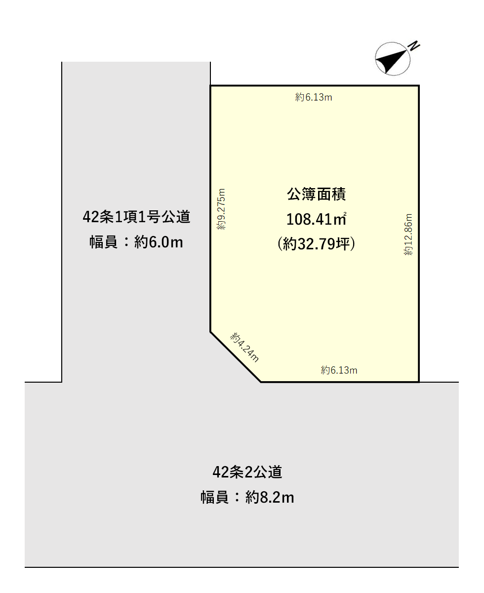 - 南西側幅員約6.0m公道、約9.2m接道/南東側幅員約8.2m公道、約6.1m接道